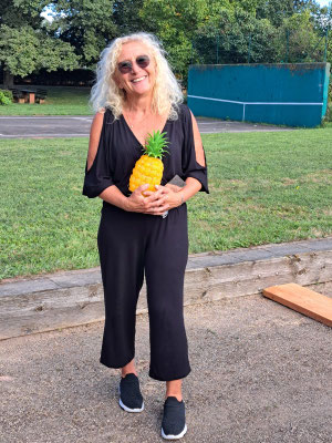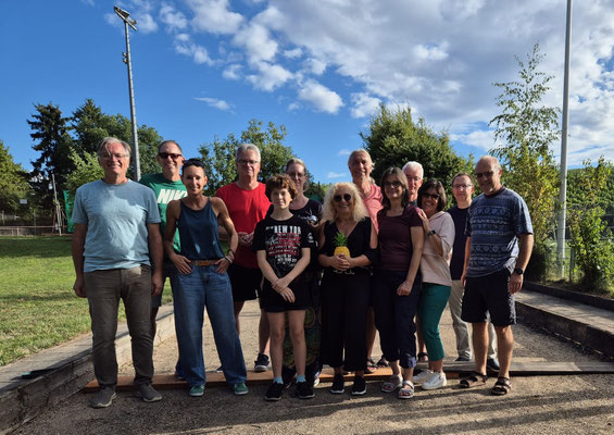 Um die im wahrsten Sinne des Wortes „Goldene Ananas“ ging es beim Bouleturnier des TC Modenbachtal auf der vereinseigenen Boule-Anlage. Gespielt wurde in Triplettes (Dreierteams). Den ganz speziellen Siegerpreis sicherten sich Brigitte Herzinger, Stefan Herzinger und Peter Brandstetter durch ein 13:10 im Finale. Das Foto links zeigt die Finalisten und die Halbfinalisten, rechts Brigitte Herzinger mit der goldenen Ananas.